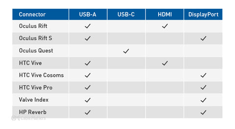 Here is a chart for quick reference: Most headsets will be perfectly paired with an active USB 3.0 Extension cable. An active DisplayPort extension cable is likely to work too if you own one of the 5 headsets utilizing DisplayPort.