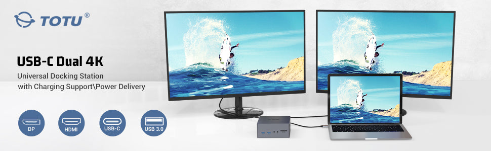 Ultra HD 4K Triple Displays: With three high-definition video output ports. Supports resolutions up to 3840*2160@30Hz with a single HDMI/DP display or 1080P if two or three displays are attached. TOTU docking station enhanced productivity and entertainment options with high-speed connectivity and support for Ultra HD 4K displays.